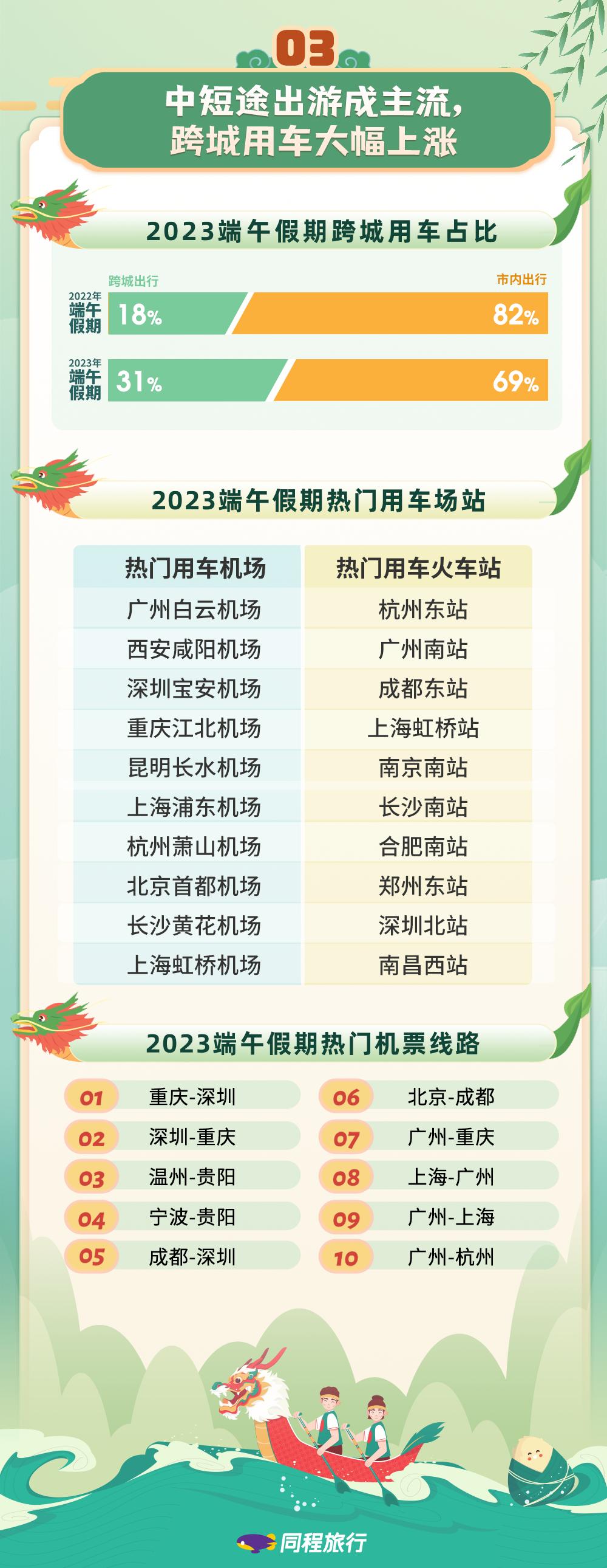 2023年端午假期,国内出行以中短途客流为主。高铁动车、公路客运、自驾游是人们端午出行的主要交通方式。