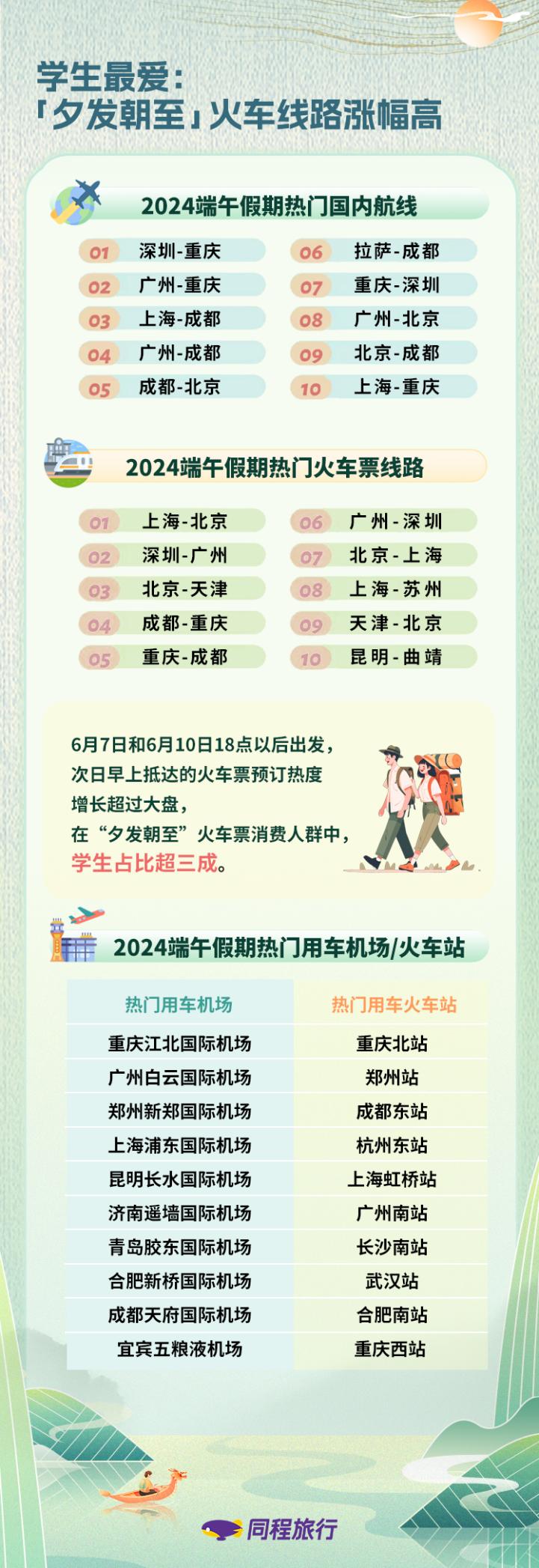 端午假期,为了高效利用3天假期,不少学生群体选择乘坐“夕发朝至”的火车,晚上赶路,白天游玩。同程旅行数据显示,6月7日和6月10日18点以后出发,次日早上抵达的火车票预订热度增长超过大盘,在“夕发朝至”火车票消费人群中,学生占比超三成。火车票热门线路则主要集中在京沪、广深、成渝、京津等核心城市之间。此外,节前山东前往拉萨的“铁腚大巴”走红网络,不少年轻游客也挖掘了更多“铁腚线路”,在端午假期出门体验。