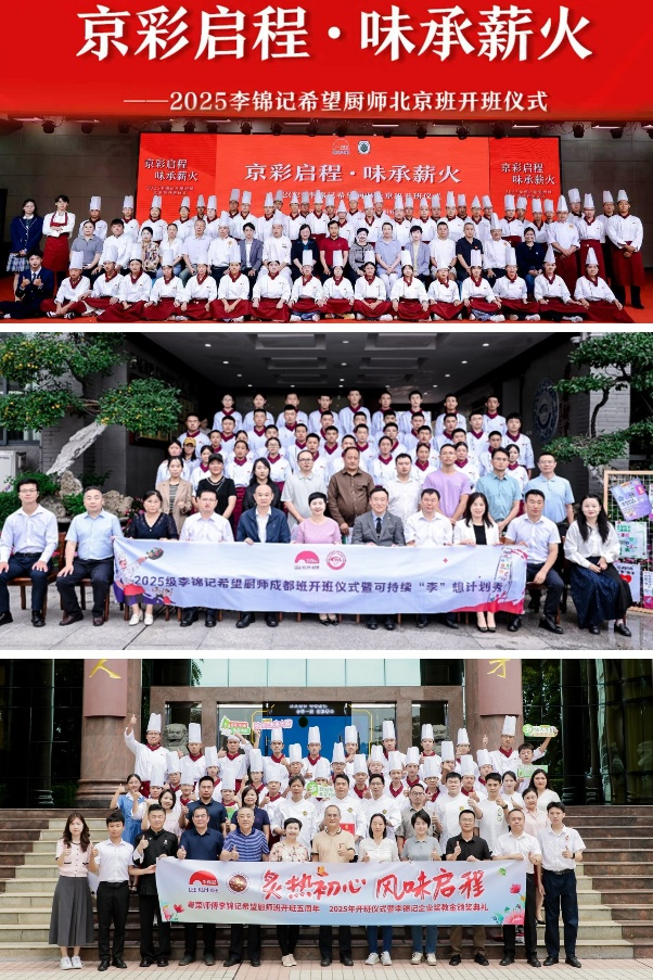 9月11日,李锦记希望厨师项目在北京市劲松职业高中举行"京彩启程,味承薪火"开班仪式,55名新生通过传统"拜师授帽"仪式接过厨师帽,立下"品如松、劲有为"的誓言。3天后,在成都财贸职高开班仪式中,40名青年在希望中“酿”新生,并在现场展示了旧物料改造的环保作品,完美融入可持续的巧思,诠释可持续“李”想计划。9月底,希望厨师粤菜师傅班亦在广州市旅游商务职业学校顺利开班,自此粤厨传承迈入新五年,为粤港澳大湾区高质量发展培育更多专业人才。三地开班延续着十四载育人初心,展望希望厨师项目十五周年,公益火种将持续传递!