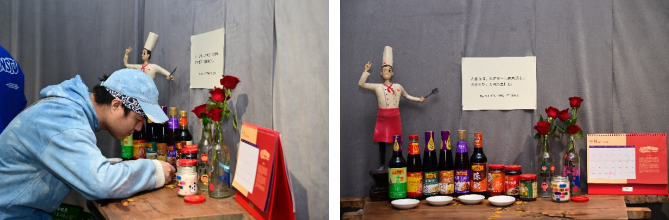 几块空心砖,搭着一块由成都本地非遗餐厅“孔干饭”提供的旧时收割水稻的抖桶,就成了一张特别的桌子,酷似厨房的一角,整齐划一地摆上了李锦记酱料,从薄盐生抽到陈醋,从财神蚝油到蒸鱼豉油,再到蒜蓉辣椒酱和黄豆酱,每一款都拥有一个特别的味道,让李锦记“餐餐陪住你”的精髓体现在酿造艺术中的酱料里。