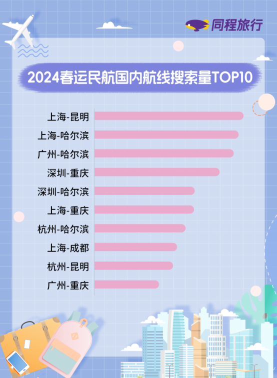 除了哈尔滨相关热门航线外,春运整体搜索热度较高的国内航线还有上海-昆明、深圳-重庆、上海-重庆、上海-成都、杭州-昆明、广州-重庆等。相关热门航线既是热门春节旅游线路,同时也是返乡探亲客流较为集中的线路。