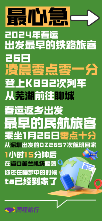 春运首日的清晨,当普通打工人从睡梦中醒来,一些“心急”的人已经和家人团聚了。同程旅行数据显示,2024年春运出发最早的铁路旅客在1月26日凌晨零点零一分登上了K892次列车,而最早出发的民航旅客在当天上午零点10分从深圳出发,1小时15分钟后就在海口美兰机场降落了,可能是春运最早抵达家乡的一批旅客。