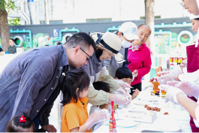 李锦记希望厨师团队的现场互动更让市集充满烟火气。年轻厨师们不仅用蔬菜搭配特色酱料,烹制出低糖低盐的凉拌菜供居民免费品尝。还特别设置了“中秋月饼制作区”,在希望厨师的指导下,居民和小朋友们动手制作低糖冰皮月饼,这一环节不仅让居民们享受到了DIY的乐趣,更让中秋团圆多了份健康意义。