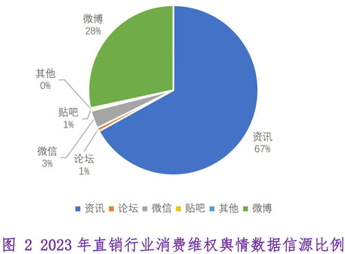 通过对直销行业消费维权舆情的数据源进行分类统计,其中资讯类信源包括媒体报道、政府网站以及消费者网等消费维权类信息网站。资讯类数据比例达到67%,为主要数据源;微博类数据比例达到28%,微信类数据比例达到3%。具体数据源比例如下图: