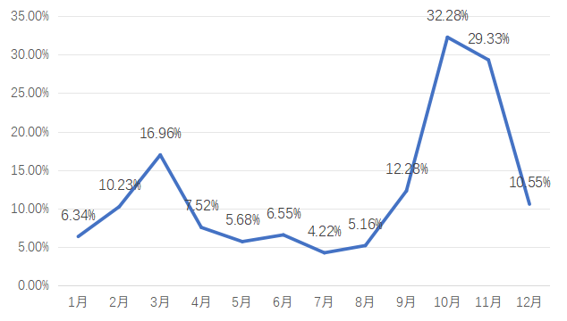 围绕直播带货舆情问题类型,本报告对2023年直播带货问题有关的舆情信息进行采集,并对数据进行了月度占比汇总,具体情况如下图所示: