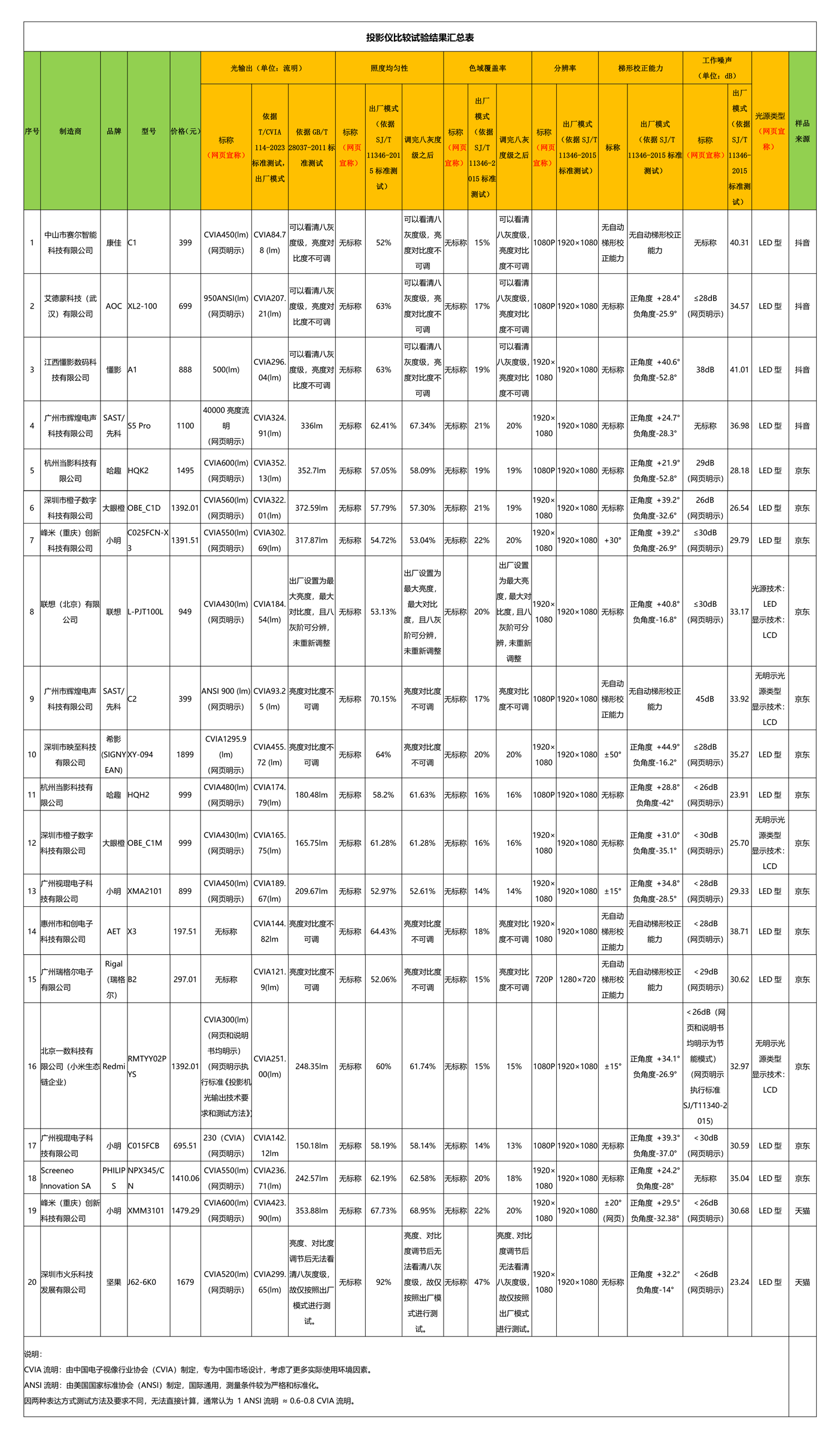 本次比较试验的20台投影仪样品测试结果显示如下: